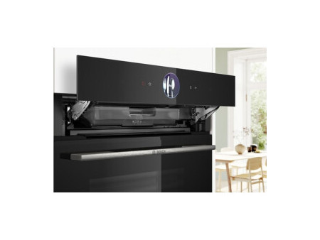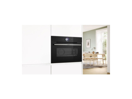 Hornos compactos multifunción con vapor BOSCH, CSG7361B1, Compacto, Multifunción con vapor 100%, A+, Integrable, 45 cm., 47 l., 21 F, Asistente de limpieza con agua, HC, Ap. Abatible, Cristal negro, Display TFT touch Plus, Asistente de cocinado Assist, Reloj electrónico con programación de inicio y paro, f. AirFry, f. SteamJet, SoftMove Infinity Serie 8 Serie 8, Horno compacto con vapor, 60 x 45 cm, Negro BOSCH CSG7361B1. Horno compacto 100% vapor, disfruta de 3 modos de cocinar diferentes: cocción tradicional, cocción tradicional con aporte de vapor y cocción al vapor 100%. Display TFT touch control. Home Connect para el control a través de dispositivos móviles. Anillo de control digital: la manera más fácil e innovadora de seleccionar los ajustes del horno. Pantalla táctil TFT Plus: máximo control con el innovador anillo de control digital y la pantalla táctil TFT ampliada Función Steam Plus: para cocinar alimentos tiernos y sanos hasta a 120 °C. Calentamiento 4D: distribución uniforme del calor para obtener resultados perfectos. Función Air Fry: prepara a la perfección alimentos como verduras y patatas fritas.